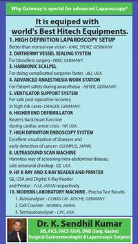 Dr. K. Sendhil kumar delivers new energy and excellence to his patients by his years of experience in gastro surgery and new techniques and technologies equipped at highly advanced endo and laparoscopy centre " Gateway Clinics ". In keeping with our philosophy a multidisciplinary approach to the investigation and management of gastro intestinal disorders is served by an endoscopy unit that incorporates the use of state of art Endoscopic technology.